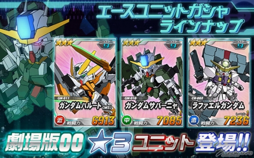 今天起在王牌機體轉蛋中,出自『電影版 機動戰士鋼彈00 ‐A wakening of the Trailblazer‐』的「★3 妖天使鋼彈(MS)」、「★3 獄天使鋼彈」、「★3療天使鋼彈」登場。