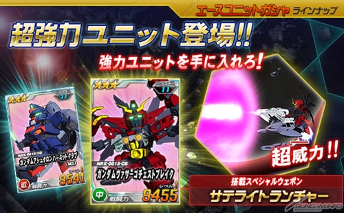 從今天起在王牌機體轉蛋中,搭載了特別武器「衛星破壞砲」的「★3法薩可鋼彈CB」和「★3 阿斯特龍HC(MS)」登場。