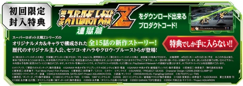 初回限定封入特典是附屬由「超級機器人大戰Z」系列的原創機械&角色構成,全部共15話的新作故事「第3次超級機器人大戰Z 連獄篇」下載用產品代碼。