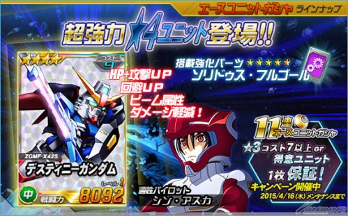 除了在王牌機體轉蛋中追加「★4 命運鋼彈」等等機體以外,還同時開始「11連王牌機體轉蛋『★3 COST 7以上or得意機體1枚保証活動』」為首的4個活動。