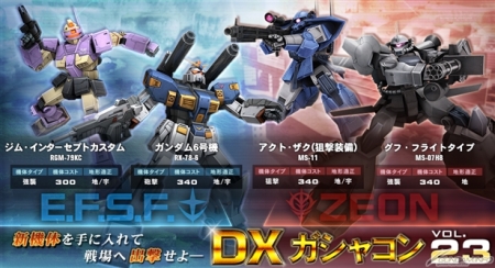 這次第23彈中,地球聯邦軍有「鋼彈6號機」和「吉姆・迎擊特裝型」,吉翁公國軍則有「古夫飛行試驗型」和「高機動型薩克(狙擊裝備)」新登場。趁這個機會來玩遊戲,取得新機體吧。