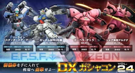 這次是第24彈,地球聯邦軍追加「鋼彈試作3號機」和「G-LINE(標準裝甲)」,吉翁公國軍則是「卡貝拉・迪特拉」和「夏亞專用傑爾古格」登場。請趁這個機會來玩遊戲,獲得新機體吧。