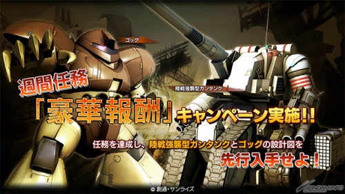 週間任務「豪華報酬」特別活動中,只要在期間出擊便可累計「CP(活動點數)」,CP達到一定數量就可以獲得特別報酬。報酬內可以搶先取得新活動機體「陸戰強襲型鋼坦克」及「葛克」的設計圖等等,準備了相當豐富的豪華報酬。