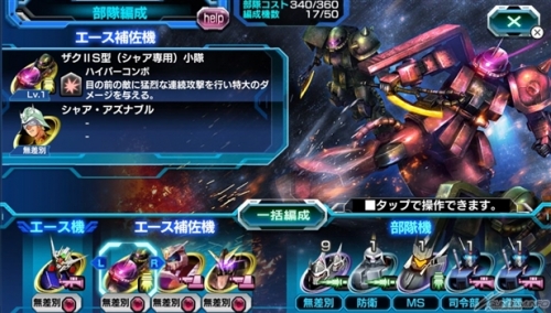 最多可以指揮50台的MS部隊進攻敵方要塞的「機動戰士鋼彈 戰鬥要塞(暫)」中,部隊的編成將會直接關乎勝敗。首先就來學習部隊的配備方法和規則,編成與自己戰略相符的部隊吧。