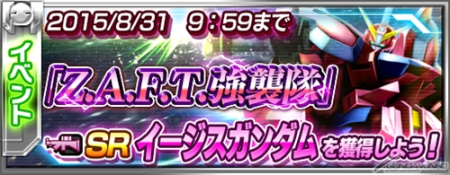 首次的防衛任務活動「Z.A.F.T.強襲隊」中,選擇在活動期間內才有舉辦的防衛任務,就會有Z.A.F.T.的大部隊來進攻我方基地。擊退一批一批進攻而來的Z.A.F.T.MS部隊,獲得SR「神盾鋼彈」,目標是最大進化。
