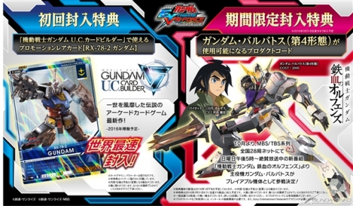 再加上內附初回封入特典,可以使用在預定2016年開始營運的大型機台遊戲「機動戰士鋼彈 U.C.卡片編組」的宣傳稀有卡片「RX-78-2 鋼彈」。