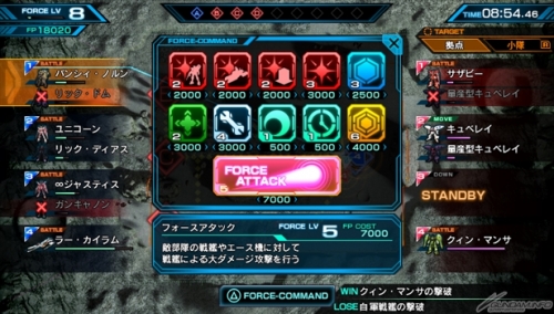 在指令模式下按△按鈕即可打開武力指令選單。消費FP使用指令,可以請求來自戰艦的支援。指令有各式各樣的種類,像是暫時提升我軍全體攻擊力等等,提升武力等級後可以使用的指令還會進一步增加。