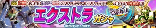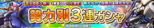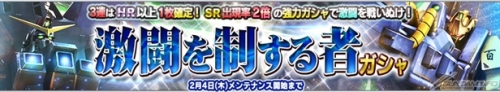 追加「SR 破滅鋼彈」、「SR 百式」等等10張新卡片的轉蛋。SR出現率2倍,且3連抽轉蛋的第三張確定會出現HR以上的卡片。