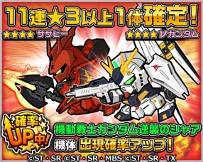 『逆襲のシャア』イベント攻略には、イベントガシャにて同シリーズの機体を獲得するのがポイント。イベント期間中は、同シリーズ機体の出現確率がアップし、11連ガシャは★3以上が何度でも必ず手に入るお得なガシャとなっているのでお見逃しなく。このチャンスに「νガンダム」や「サザビー」を入手しておこう。