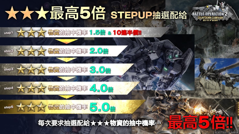 隨STEP數抽到★★★物資的機率會逐步提昇,到STEP5時抽到★★★物資的機率會提昇至5倍!!