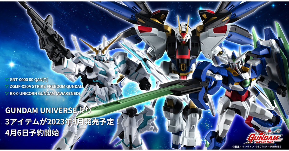 魂NATIONS推出的「GUNDAM UNIVERSE」最新彈,攻擊自由鋼彈、量子型00、獨角獸鋼彈(覺醒時款式)決定於9月發售。