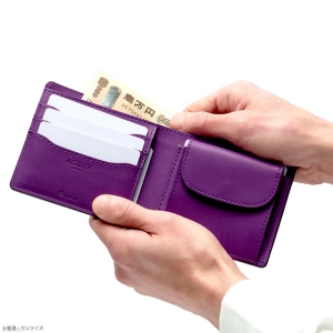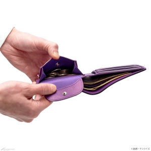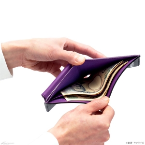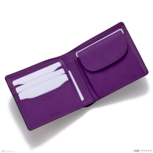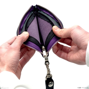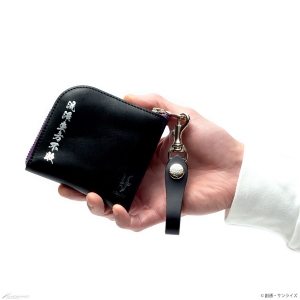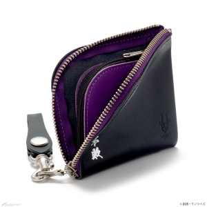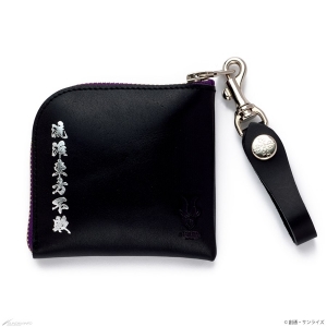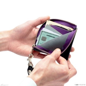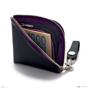 以「流派東方不敗」文字燙銀,與紫色形象配色拼接,簡約的短夾。短夾是雙層構造的L字拉鍊口袋,内袋可以收納20個以上的零錢。利用零錢袋左右的空間,可以分別放入紙鈔及卡片,附有的吊環能拆卸。可固定在褲子的皮帶環及包包握把。