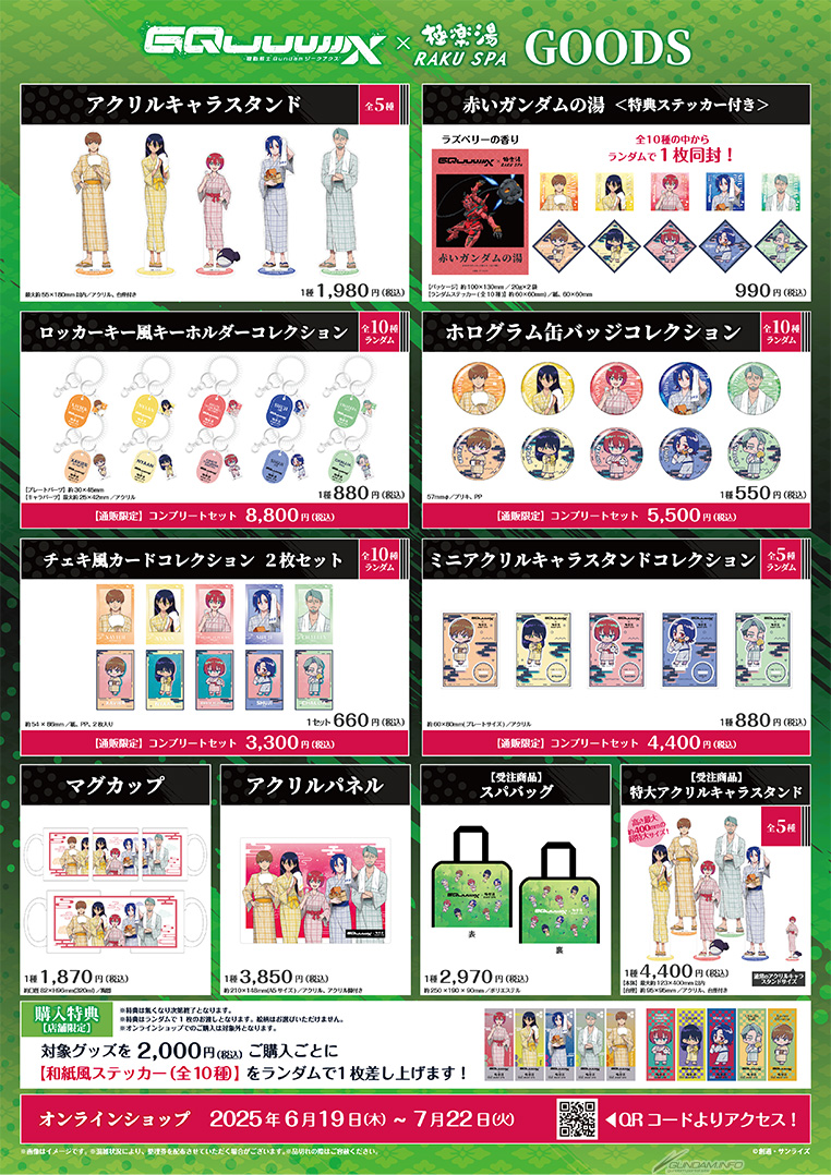 在此次合作中,您可以通過入場費購買套裝獲得限量版消聲巾的“GQuuuuuuX Plus Set”、“亞克力角色台”、“紅鋼彈之湯”和其他原創設計合作商品將發售。 合作商品也可以從 Gokurakuyu Group 的官方在線商店購買。