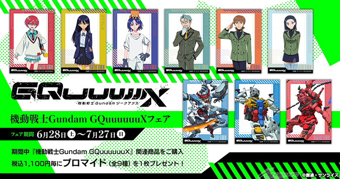'機動戰士高達GQuuuuuX“相關角色周邊商品每1,100日元(含稅),或書籍、CD、Blu-ray、DVD(含稅1,100日元以上)每1,100日元(含稅),即可獲贈特別”溴化物“(共9種/托盤迪因規格)1張”