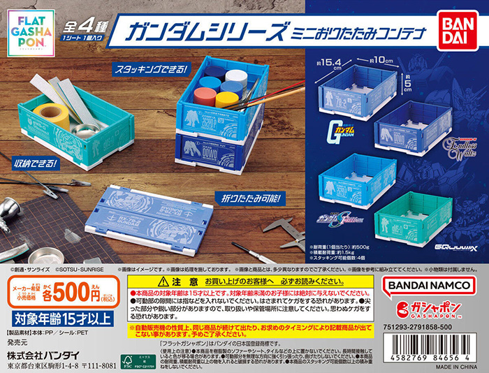 “[Flat Gashapon]鋼彈Series Mini Oritatami Container”將於 7 月第 3 周起在全國扭蛋自動售貨機和其他商店依次發售。 總共有 4 種類型,價格為一次 500 日元(含稅)。