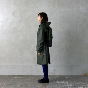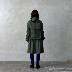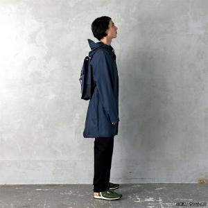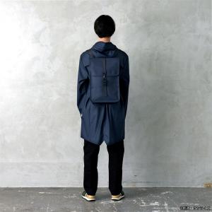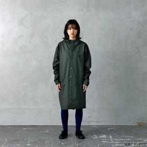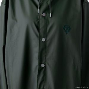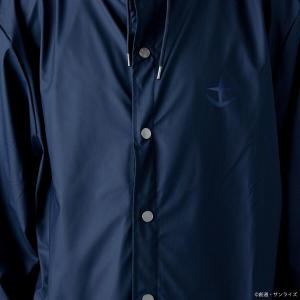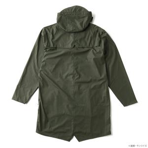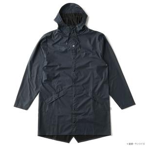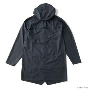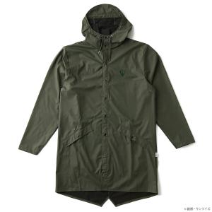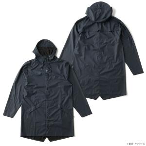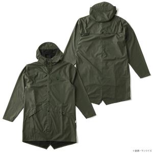 在「RAINS」的代表性商品「Long Jacket」,在同色系本體的胸口印上地球連邦軍・吉翁軍標誌,有著北歐特色的極簡洗鍊設計。正面採用了按壓式鈕扣,在左右都設置了口袋。背面採用呈現俐落剪裁的斜形裁片,下擺的三角縫線有著點綴的效果。100%聚酯纖維製的布料非常輕薄且具有伸展性,可以毫無壓力地穿著。袖子及風帽的縫線處,以線縫製後再以超音波機械進行特別結合,使縫線部分可預防進水。