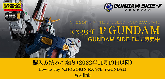 事前預約受理至11月15日(二)23:59,完成預約的顧客可於11月19日(六)至12月11日(日)的期間在GUNDAM SIDE-F門市購買「超合金 RX-93ff ν鋼彈」。另外,若申請數量超過預約數量時將近進行抽選。