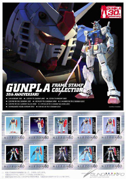 為了紀念鋼彈模型30周年所發售的原創郵票是以BANDAI的「鋼彈模型」為題材,從1980年發售的初代「1/144 鋼彈」到最新品牌的第1彈「1/144 RG RX-78-2 鋼彈」為止的歷代鋼彈模型為設計所製作,搭配以原創設計的底紙和資料夾,限量發售5,000組。