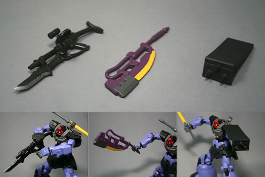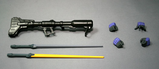 基本裝備為巨型火箭砲與電熱劍2種。不只附能夠拿取裝備的手部,最適合拿電熱劍的帥氣張開手勢也有喔!