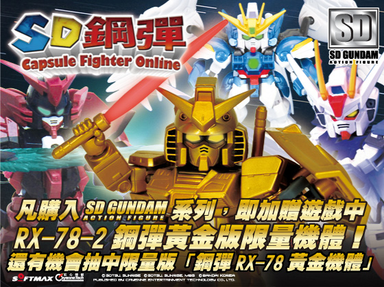 凡購買台灣版「SD GUNDAM ACTION FIGURE」可動玩具系列,憑附贈的序號就可以在「SD鋼彈 Online」遊戲中兌換「鋼彈(活動黃金機體)」機體一台以及遊戲幣3000G,不僅如此,只要儲值「SD GUNDAM ACTION FIGURE」可動玩具系列序號的玩家,還可以參加每個月的抽獎,贈送「SD GUNDAM ACTION FIGURE」可動玩具系列中限量版的「鋼彈RX-78黃金機體」,可千萬不要錯過這次難得的機會,並期待之後發售的機體吧!