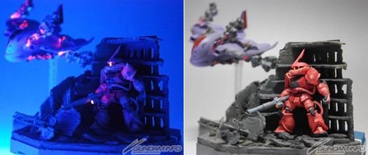 重現「卡爾馬之死」的場面。夏亞薩克改造成全身可動+部分塗裝。變更裝備為火箭砲。卡烏戰艦使用1/1200。以黑光攝影為前題進行塗裝,不想讓它發光的的部分以UV遮蓋。