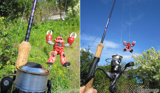 薩克裝上夏亞專用茲卡克的手部並接上釣餌鉤,活用紅色製成美國龍蝦風格的釣餌。能釣到東西嗎~。