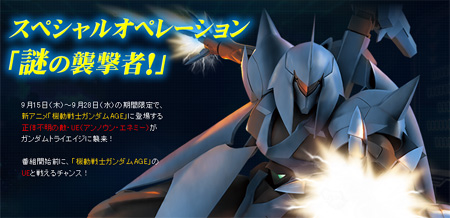 9月15日(四)~9月28日(三)期間限定、新動畫『機動戰士鋼彈AGE』裡登場的UE(未知敵人)將襲擊GUNDAM TRY AGE。
