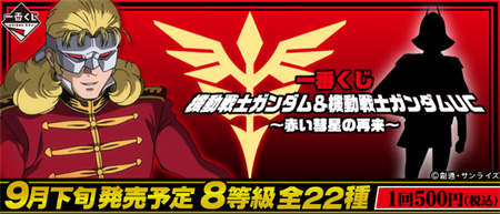 BANPRESTO的「一番籤」系列推出「一番籤 機動戰士鋼彈&機動戰士鋼彈UC ~紅色彗星再臨~」將於9月下旬開始販售,價格為1次500日圓(含稅)。