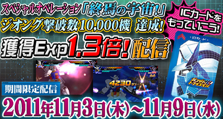 漂亮地達成特殊作戰「終焉的宇宙!」中登場的「吉翁克」10,000機撃破!獲得Exp1.3倍活動」決定實施!