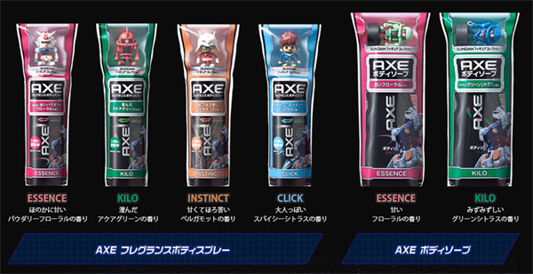 本次發售的「附贈鋼彈原創人物模型AXE」,「AXE 芬芳體香噴霧90g(4款)」與「AXE 身體沐浴乳300ml(2款)」,是與鋼彈角色的人物模型(全6種)共同組合的限定包裝。