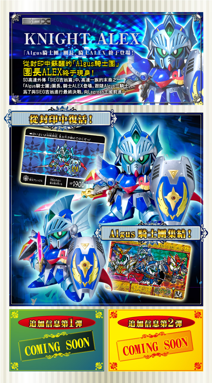 Algus騎士團最後的一個人,騎士團長「騎士ALEX」終于在SDX系列登場! 今後,分成2囘進行公開,請不要錯過後續的消息! |
