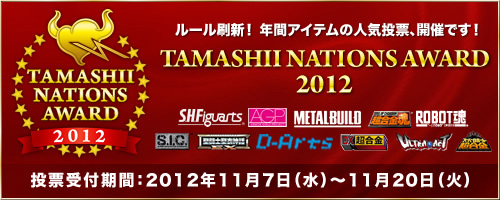 由BANDAI收藏家事業部經營的魂NATIONS品牌官方網站「魂Web」上,每年固定進行年度商品人氣投票,今年也照慣例開始接受各界參加「TAMASHII NATIONS AWARD 2012」投票。