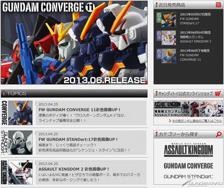 本網站將會公開人氣系列「FW GUNDAM CONVERGE」和「FW GUNDAM STANDart」、以及最新商品「機動戰士鋼彈 ASSAULT KINGDOM」等鋼彈食玩的最新情報。可以在發售前觀看產品的內容圖片與彩色圖片。
