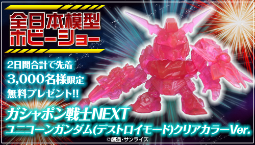 10 月11日(五)開始到13日(日)在千葉・幕張MESSE舉辦的「全日本模型HOBBY SHOW」的BANDAI攤位上,將在一般公開日的10月12日(六)、 13日(日)2天內,每天提供1,500個名額,2天共計送出3,000個名額,依先來後到的順序送給在攤位上填寫簡單問卷的嘉賓們「轉蛋戰士NEXT 獨角獸鋼彈(毀滅模式)透明色Ver.」一台。