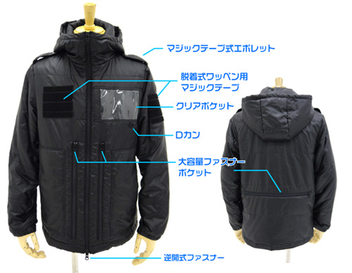 D字環(金屬零件)可以掛角色吊飾或者是鑰匙圈,胸部和肩部有裝著「著脫式徽章用魔術氈」,是一件充滿玩心的夾克。