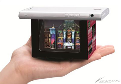 在開封的外盒裝上安裝公仔和透明板,接著運用智慧型手機讀取外盒裝上紀錄的二維條碼,讓播放的專用影像向著公仔設置在下方,就能夠模擬、體會各式各樣的立體影像囉。