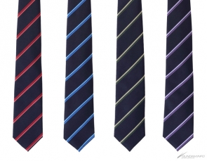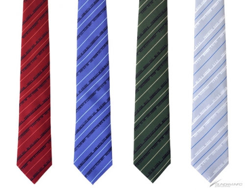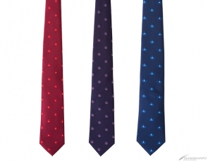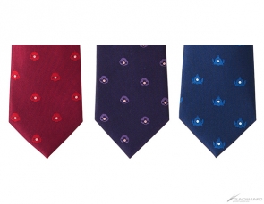 表面是採用會讓人想起動力管的提花織,以樸素的素色花紋呈現出高級感。採用會聯想到各種MS配色的領帶內襯,由左到右分別是「夏亞・阿茲納布爾 個人標誌」、「蘭巴・拉爾個人標誌」、「吉翁公國軍標誌」的設計。