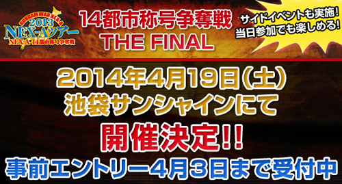 去年6月起在全國各地14個都市和香港、台灣舉辦的集換式卡片遊戲「鋼彈大戰NEX-A」官方大賽「NEX-A Tour 2013」。決賽的「14都市稱號爭奪戰 THE FINAL」決定4月19日(六)在東京・池袋Sunshine City舉辦。