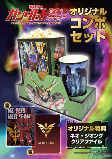 本套餐是以「鋼彈UC」圖樣的紙餐具提供爆米花和飲料的商品,附有A4大小的特典「新・吉翁克 透明資料夾」。