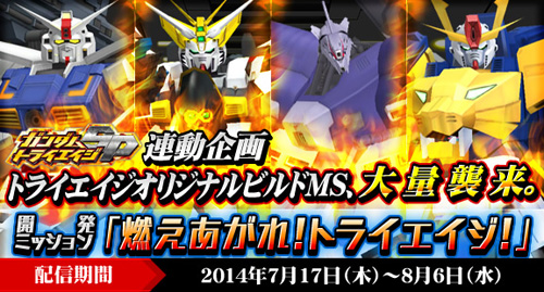 本任務為了紀念3DS「鋼彈 TRY AGE SP」於本日發售而推出,「ZZZ鋼彈」、「全方位推進精神感應型鋼彈」、「Ϝ・阿吉爾」、「天王神威鋼彈」等TRY AGE 原創BUILD MS將一舉來襲。