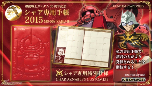 「夏亞専用筆記本2015」是為了紀念『機動戰士鋼彈』誕生35周年的特別商品。除了在封面上印有夏亞・阿茲納布爾的愛機「薩克II」之外,在封面的側面加上了金色。此外,月曆・週曆的頁面中也印刷了許多夏亞在劇中令人印象深刻的活躍場面。