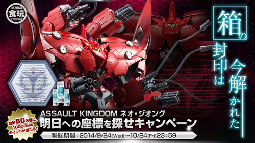 本項活動是要尋找隱藏在「ASSAULT KINGDOM 新吉翁克」商品頁面中的「ASSAULT KINGDOM系列 前往明日的座標」,並從回答問券的人抽選出50名贈送1,000日圓等值的PREMIUM點數。