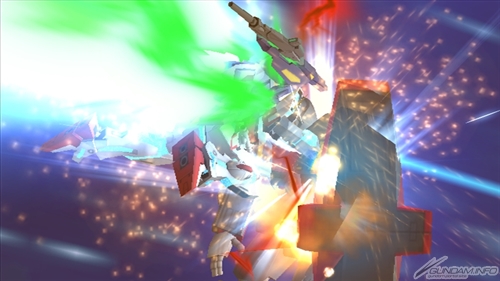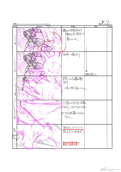 浅野: 由文字分鏡決定結構之後,就開始製作一張一張的分鏡圖。一開始我們比較傾向重現原作的演出效果。但是如果畫面老是和原作一樣的話,不同的MS在遊戲内給人的印象就會有明顯的差別。例如說「RX-78-2 鋼彈」和「能天使鋼彈」,若是忠實照原作製作的話,絶對是能天使比較容易展現華麗的演出畫面吧。