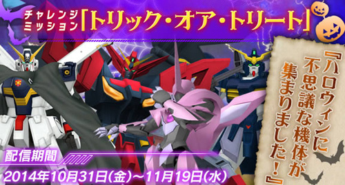 任務中,將有符合萬聖節時期的4台奇異機體「瓦沙克鋼彈」、「死神鋼彈」、「長尾型法爾西亞」、「骷髏鋼彈X1」來襲。