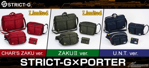 先前由「STRICT- G」和「PORTER」推出的聯名款式,有「夏亞專用薩克ver.」、「薩克IIver.」、「連邦軍ver.」等等,這次則推出了人氣商品的改款限定版。而新推出的款式則是「夏亞專用薩克ver.」和 「薩克IIver.」的肩背包,以及「連邦軍ver.」的3WAY公事包。