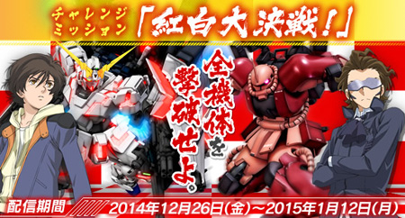 在挑戰任務「紅白大決戰!」中,「FA獨角獸鋼彈(D)」、「驚異薩克」、「鋼彈AGE-2 SPver」等紅白色的敵人部隊將會來襲。只要打贏,就有機會得到「傷害-600」効果的「鏡餅薩克」。