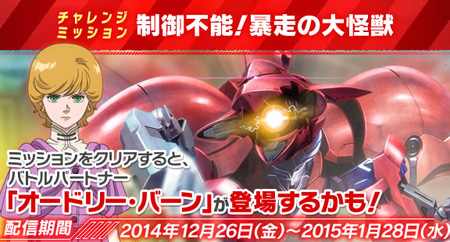 而在挑戰任務「無法控制!暴走的大怪獸」中,則會有像是怪獸的MA「尚布羅」和「貝尼羅貝」、「迪法斯」、「畢格・薩姆」等機體來襲。只要打贏,戰鬥夥伴就有可能會出現「奧黛莉.伯恩」。