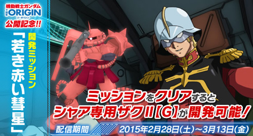 任務中會有「夏亞・阿茲那布爾」駕駛的「夏亞專用薩克II」為首的「薩克II」部隊襲來。成功過關任務,就可以把「夏亞專用薩克II【G】」當做BUILT MS來開發。發布期間到3月13日(五)為止。