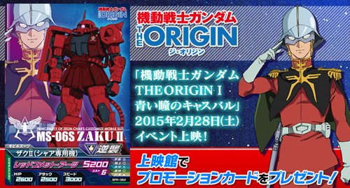 好評運作中的電子卡片遊戲「GUNDAM TRY AGE」,為了紀念『機動戰士鋼彈 THE ORIGIN I 藍瞳的卡斯巴爾』特映會從2月28日(六)起在全國13家電影院開始,並從同一天開始發布開發任務「年輕的紅色彗星」。