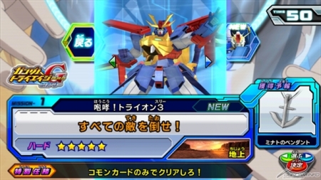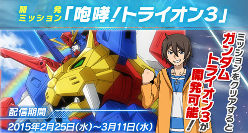 任務中會有「TRYON 3鋼彈」、「鋼彈ZZZ」、「鋼彈AGE-3 基本型」3台機體襲來。成功過關任務後,可以把「TRYON 3鋼彈」作為BUILT MS來開發。發布期間到3月11日(三)為止。